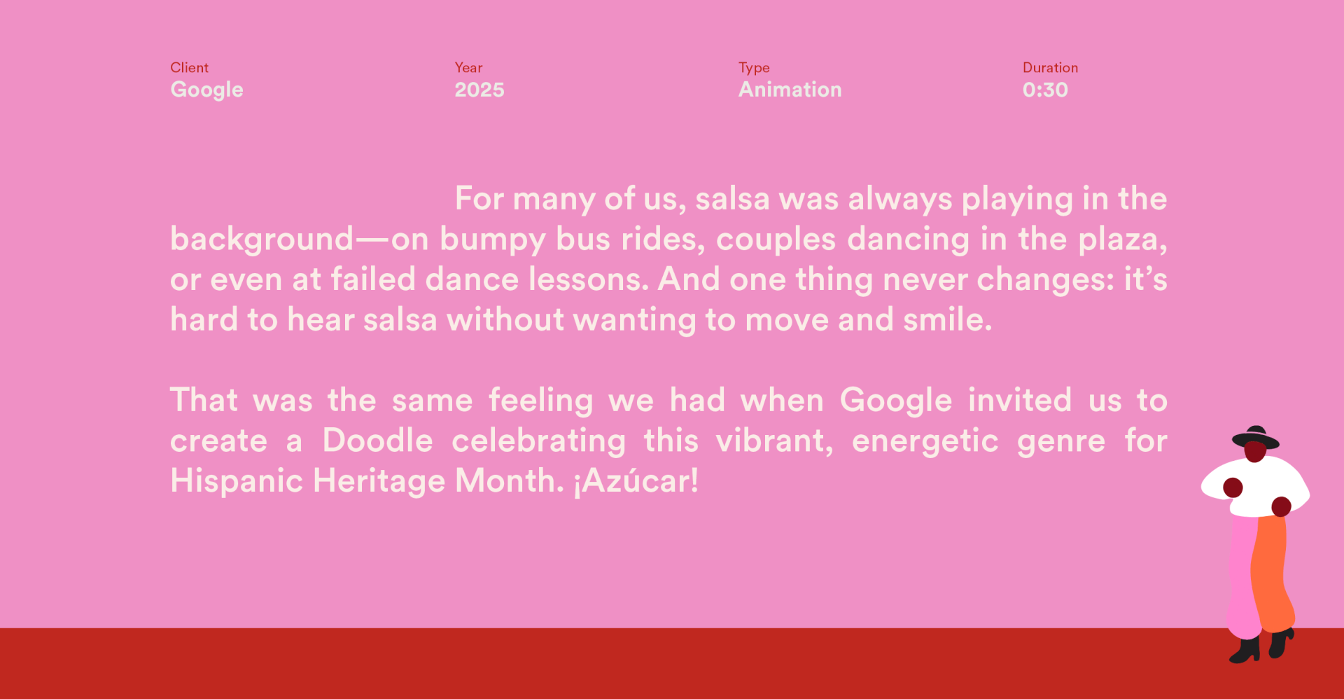 For many of us, salsa was always playing in the background—on bumpy bus rides, couples dancing in the plaza, or even at failed dance lessons. And one thing never changes: it’s hard to hear salsa without wanting to move and smile. That was the same feeling we had when Google invited us to create a Doodle celebrating this vibrant, energetic genre for Hispanic Heritage Month. ¡Azúcar!