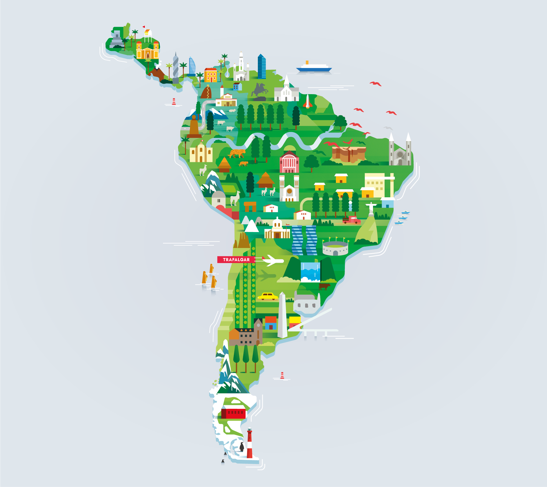 I've been honored to illustrate a series of maps that shows different destinations offered by Trafalgar. I really enjoyed the process because the intention in each map was to show the richness of each destination, highlighting its best qualities, such as fauna, architecture and culture.
